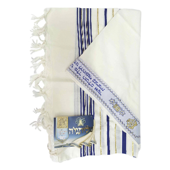 טלית צמר פס כחול זהב