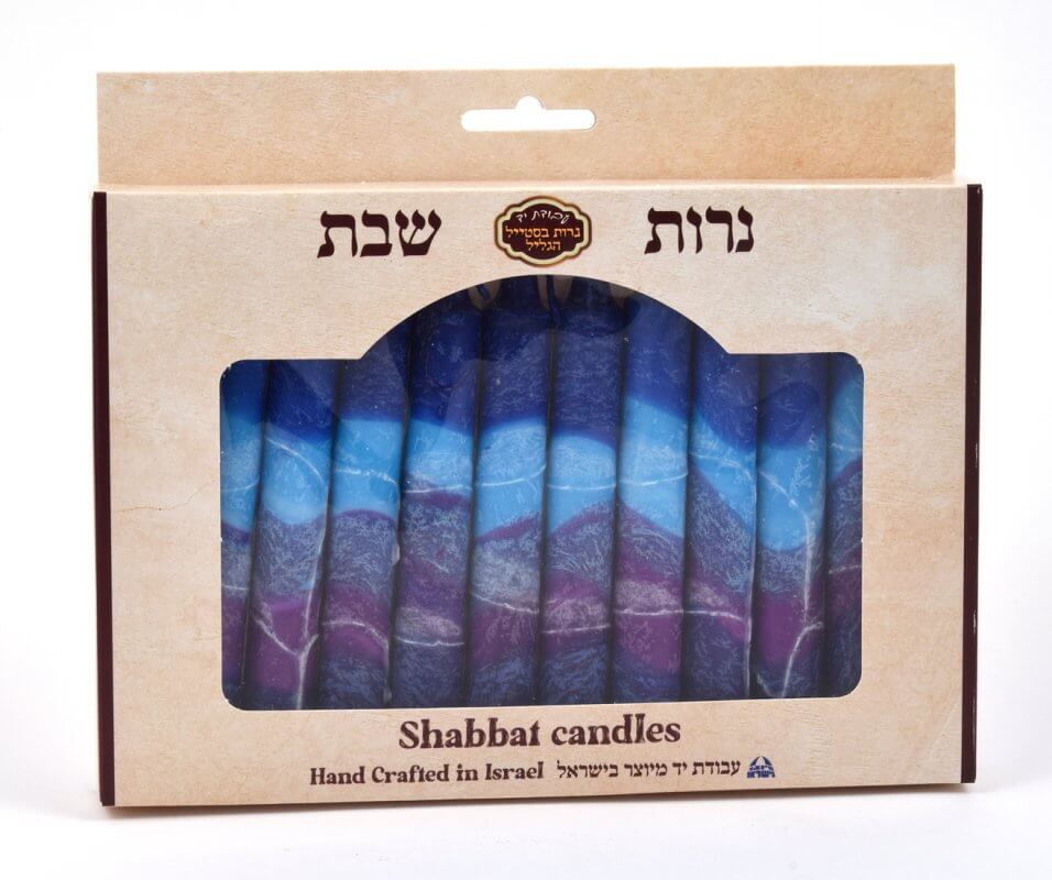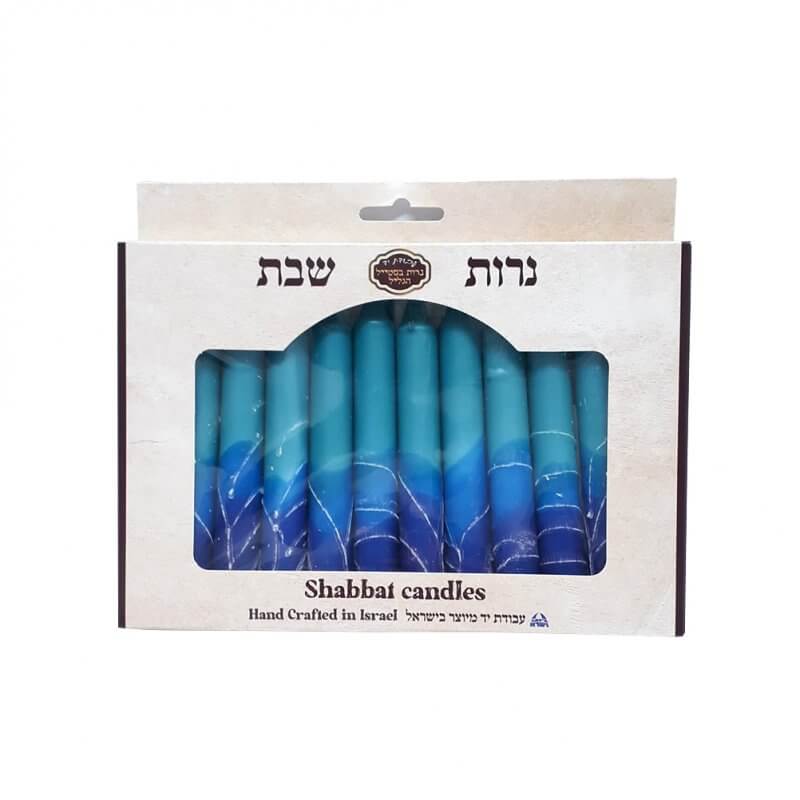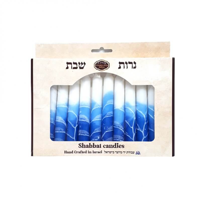 חבילת נרות שבת מקושטים בעבודת יד כחול לבן נרות בסטייל הגליל