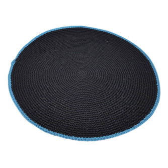 כיפה סרוגה עבודת יד שטוחה שחור פס תכלת