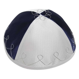 כיפת סאטן איכותית בצבעי כחול ולבן, בתוספת רקמה בצבע כסף במרכז הכיפה ובקצה.