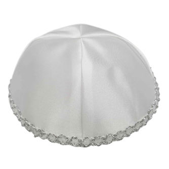 כיפת סאטן חגיגית- לבנה עם סרט רקום בקצה בצבע כסף.
