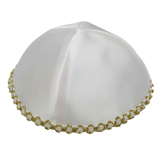 כיפת סאטן חגיגית- לבנה עם סרט רקום בקצה בצבע זהב.