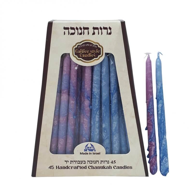 נרות בצבעי סגול וכחול, עם קישוטים, הטבולים בעבודת יד להדלקת נרות חנוכה בחנוכיות הנמצאות בכל בית. כל שכבה נותנת גוון מיוחד לנר, אשר בסופו של תהליך יוצא שכבות- שכבות של צבעים המשתלבים האחד עם השני בהרמוניה מושלמת.