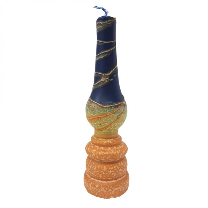 נר הבדלה מרהיב בצורת עששית בצבעי כתום צהוב וכחול בדוגמה עם קישוט, עשוי מפרפין ומיוצר באוויר הגלילי. הנרות שלנו ידועים באיכותם, ביופיים ובעיצובם בכל רחבי הארץ והעולם. הנר בנוי בצורה בטיחותית- ניתן להניחו על השולחן בזמן ההבדלה והוא אינו צריך להיות מוחזק. הנר מגיע בתוספת קישוט עבודת יד המשרה אווירת חום ויוקרה לבית היהודי.