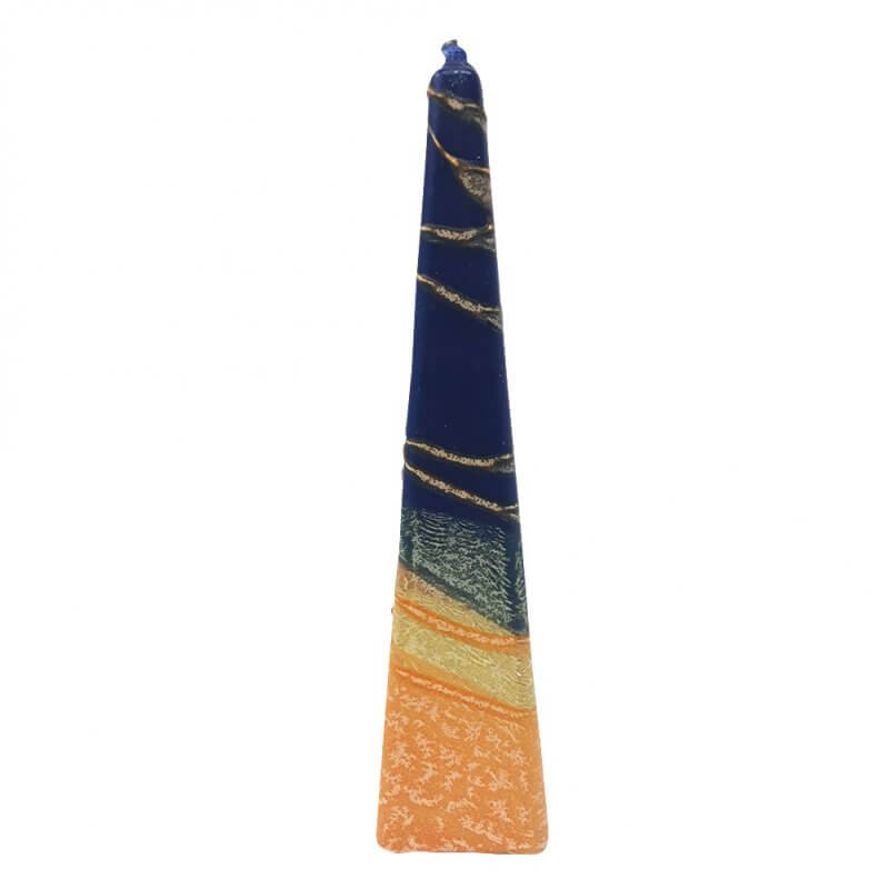 נר הבדלה מרהיב בצורת פירמידה בצבעי כתום צהוב וכחול בדוגמה עם קישוט, עשוי מפרפין ומיוצר באוויר הגלילי. הנרות שלנו ידועים באיכותם, ביופיים ובעיצובם בכל רחבי הארץ והעולם. הנר בנוי בצורה בטיחותית- ניתן להניחו על השולחן בזמן ההבדלה והוא אינו צריך להיות מוחזק. הנר מגיע בתוספת קישוט עבודת יד המשרה אווירת חום ויוקרה לבית היהודי.