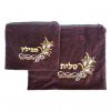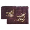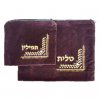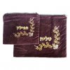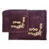 סט מספר 5 לטלית ותפילין בצבע בורדו עם דוגמה רקומה בחוט בצבע זהב. מורכב משני שקי קטיפה בשני גדלים שונים המתאימים האחד לאחסון הטלית והשני לאחסון התפילין, עם כיתוב של "טלית" ו"תפילין" בהתאם.