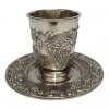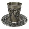 סט גביע ללא רגל עם צלחת בדוגמא מרהיבה של ענבים על הגביע ועל הצלחת, מהם מכינים את היין עליו מקדשים.