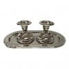 סט המכיל זוג פמוטים המצופים בניקל מבריק או בפיוטר על מגש עם דוגמת פרח. המגש שומר על המשטח עליו מונחים הפמוטים בכך שמונע טפטוך שעוות הנרות עליו.