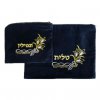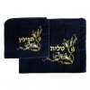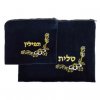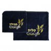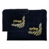 סט מספר 5 לטלית ותפילין בצבע כחול כהה עם דוגמה רקומה בחוט בצבע זהב. מורכב משני שקי קטיפה בשני גדלים שונים המתאימים האחד לאחסון הטלית והשני לאחסון התפילין, עם כיתוב של "טלית" ו"תפילין" בהתאם.