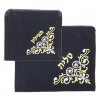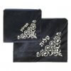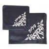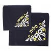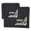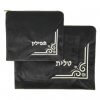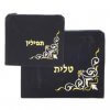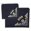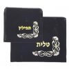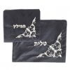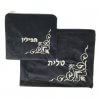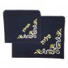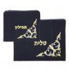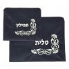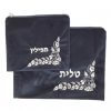 סט אריזה לטלית ותפילין העשוי מקטיפה בצבע כחול כהה, עם דוגמה רקומה בחוט בצבע כסף או זהב.